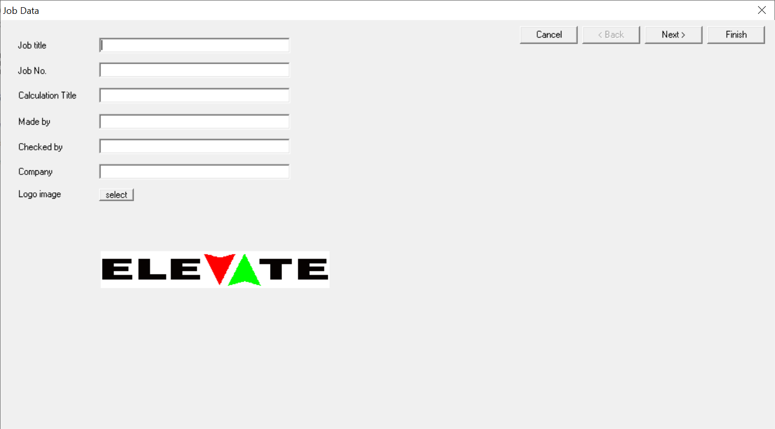 Job data allows you to record details of the project and who has performed the calculations. This information, together with the date and document name, is included in the header of all Elevate printouts.