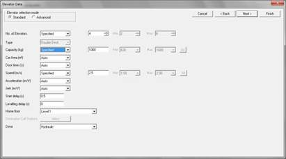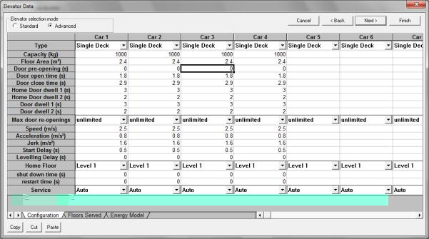 This mode can only be used when the Analysis type is Simulation. Parameters are specified individually for each elevator, so in the same group, elevators can have different speeds, capacities, etc. Elevate runs a single simulation in Advanced mode.
