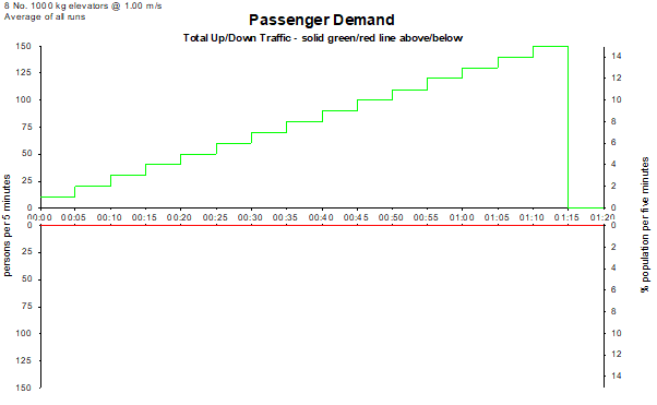 Elevate generates the traffic based on increasing demand. At the start of the simulation, the demand is at the minimum level. It then increases in steps until the maximum level is reached. The time duration, as well as the step height, can be defined.