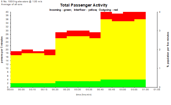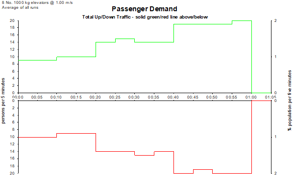 Elevate generates a one-hour traffic profile based on a non-peak traffic situation. The total traffic demand, as a percentage of the building population, is 2% for 20 minutes, then 3% for 20 minutes, then 4% for 20 minutes.