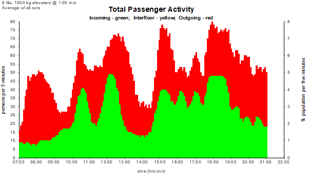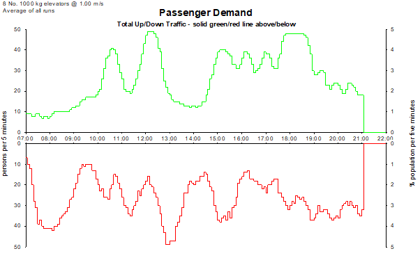 Elevate generates an example all-day traffic profile based on the traffic profile presented by Mr George Strakosch in The Vertical Transportation Handbook. The profile is based on the requirements of a residential building.