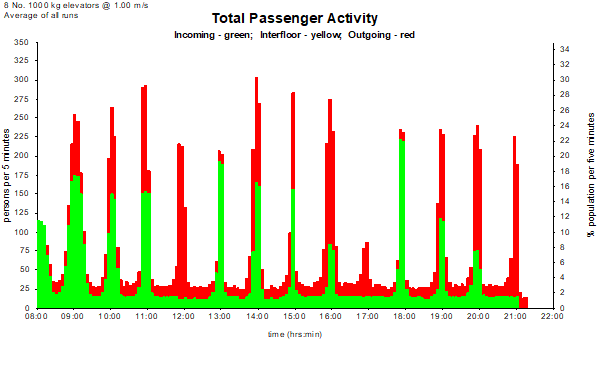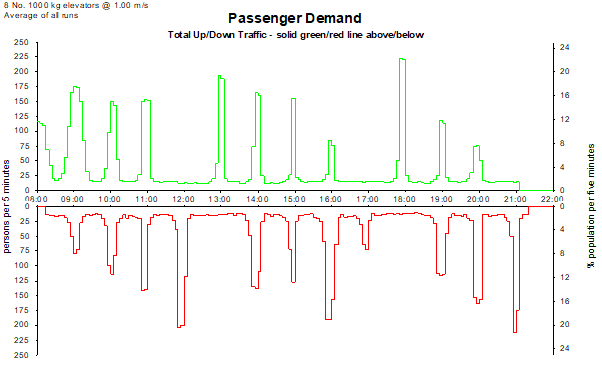 Elevate generates an example all-day traffic profile based on the traffic profile presented by Mr George Strakosch in The Vertical Transportation Handbook. The profile is based on the requirements of a school building.
