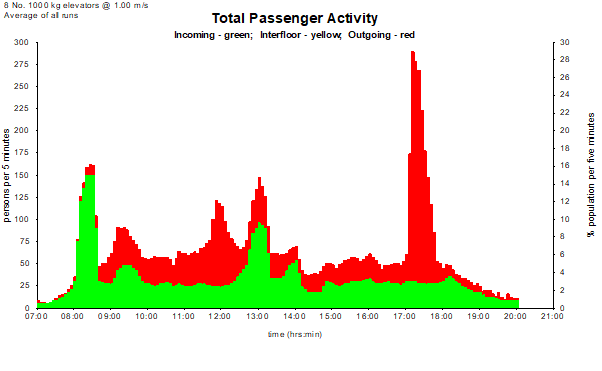 This is a classical example of traffic in buildings; most users prefer to use the Siikonen full day template which is more representative of modern buildings.