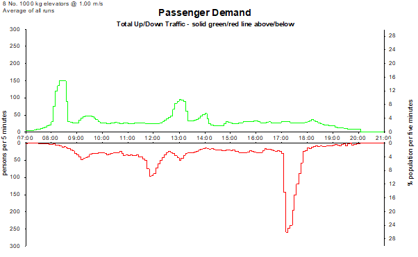 Elevate generates an example all-day traffic profile based on the traffic profile presented by Dr Gina Barney in CIBSE Guide D, Transportation Systems in Buildings. The profile is based on the requirements of an office building.
