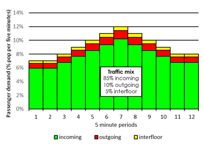 This template is discussed in CIBSE Guide D 2020 Section 4. The template is based on the requirements of an office building, with twelve 5-minute periods where the passenger demand rises to a peak of 12% with a traffic mix of 85% incoming, 10% outgoing and 5% interfloor. This is shown in Guide D Figure 4.8 as follows:
