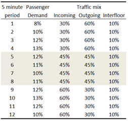 This template is defined in CIBSE Guide D 2015 and 2020 Section 4. The template is based on the requirements of an office building, with twelve 5-minute periods where the passenger demand rises to a peak of 13% with a variable traffic mix to reflect the greater outgoing demand at the beginning of lunch and the greater incoming demand at the end of lunch.