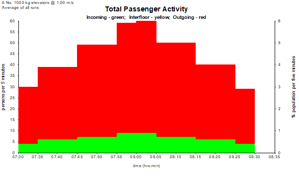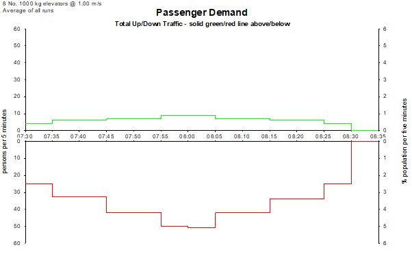 Elevate generates an example morning peak traffic profile for a residential building based on survey data published by Dr Marja-Liisa Siikonen at the Lift & Escalator Symposium. For the latest discussion of the application of this template, please see CIBSE Guide D 2020. The simulation runs between 07:30 hrs and 08:30 hrs.