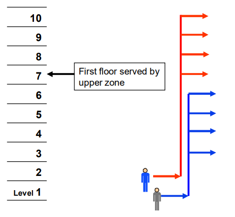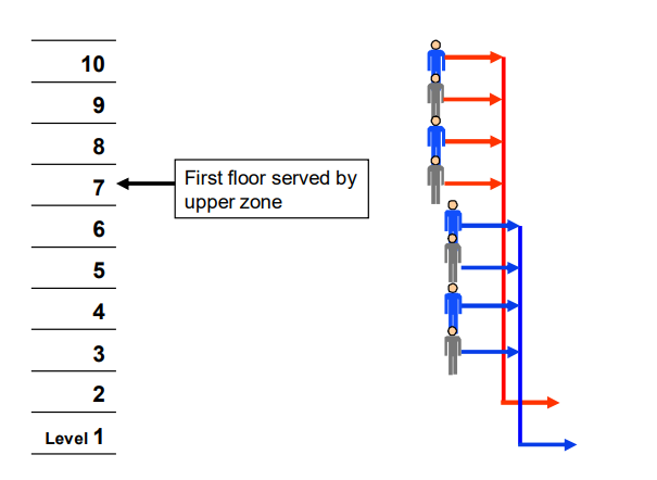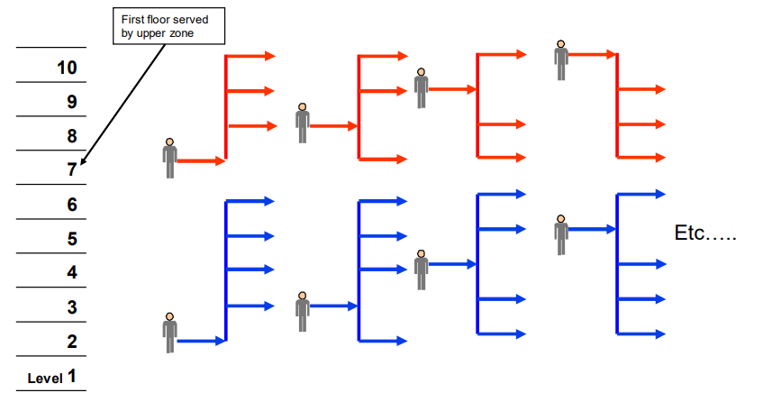 Zoned 2 cars per shaft with interfloor traffic crossing zones allows people from the lower zone to travel to the upper zone and vice versa. This provides additional flexibility, but will have an impact on handling capacity. This can be represented: