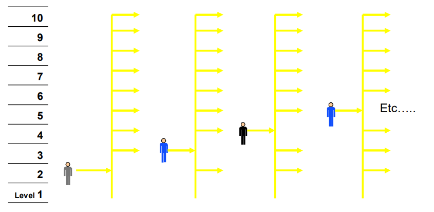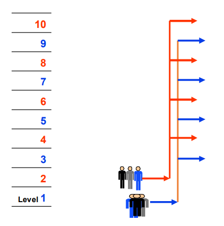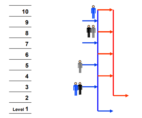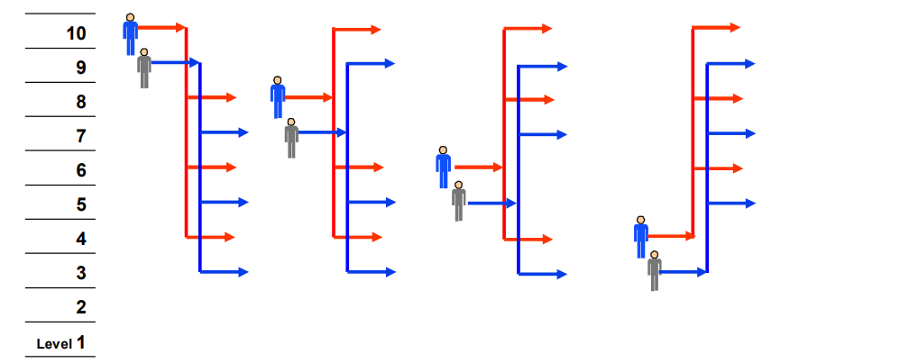 Double Deck with odd to even interfloor traffic allows for interfloor traffic to be unrestricted. This provides additional flexibility, but will have an impact on handling capacity. It can be represented: