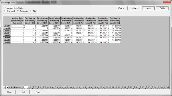 For all rows completed in All Periods, you must complete the corresponding arrival rate and destination probability table, which can be selected by clicking on the 1, 2, etc. tabs.