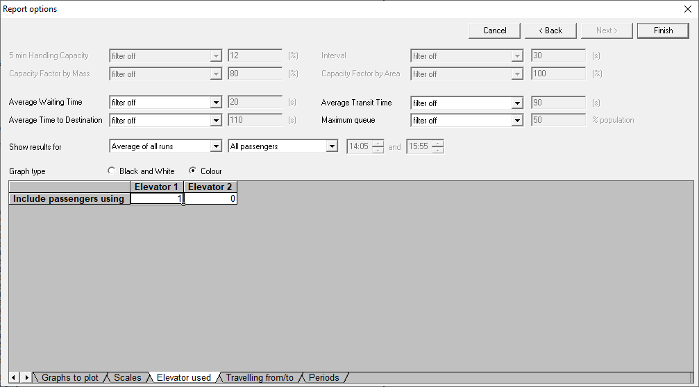 To analyse results for passengers using specific elevators, use the Elevator Used tab. Set 1 to include and 0 to exclude each elevator. For example, to analyse passengers using only Elevator 1, set Elevator 1 to 1 and all others to 0.