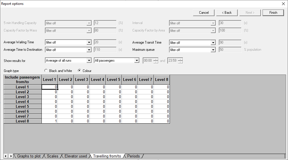 For analysis restricted to specific journeys, use the Travelling From/To tab. Set 1 for desired origin-destination pairs and 0 for others. For example, if you wanted an analysis of only passengers travelling from level 8 to level 1, configure the table as follows.