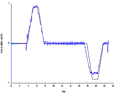 Distance, Velocity, Acceleration, and Jerk plots are available. The ideal plot is shown in black, and the measured values in blue.